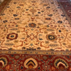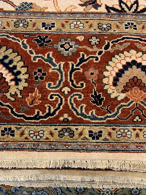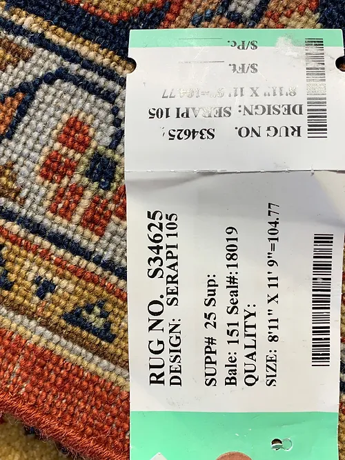 This is a fine hand knotted rug. The design is called Serapi. It is made in India. The material is 100% wool pile. The background is Ivory with rust border. The size is 8’ 10” x 11’ 9”. The shipping is within USA. Outside of USA please inquire about shipping before purchasing this rug.