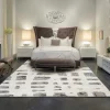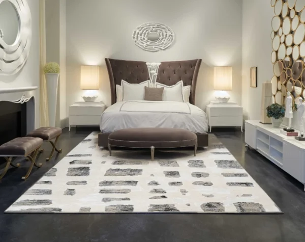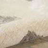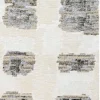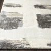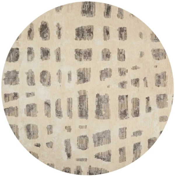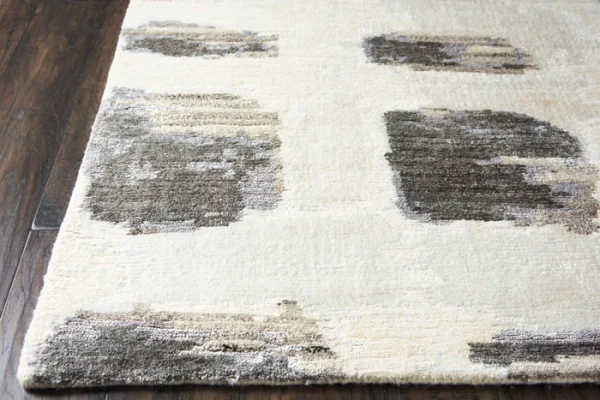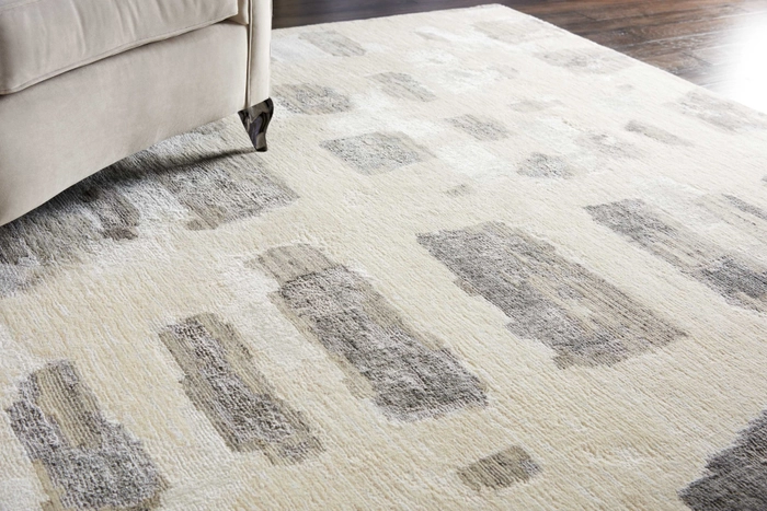 Light natural ones with shades of gray create a broad woven effect in this bold patterned rug of wool, linen, silk and bamboo.