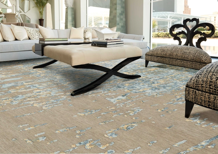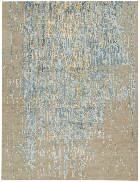 A glistening waterfall effect plays out perfectly over the wool and silk of this hand-woven Christopher Guy rug. Glistening gold accents peaceful blues as they shimmer across the neutral field, creating a breathtaking reflection of natural beauty for your home.