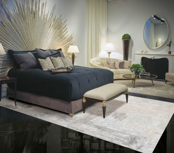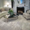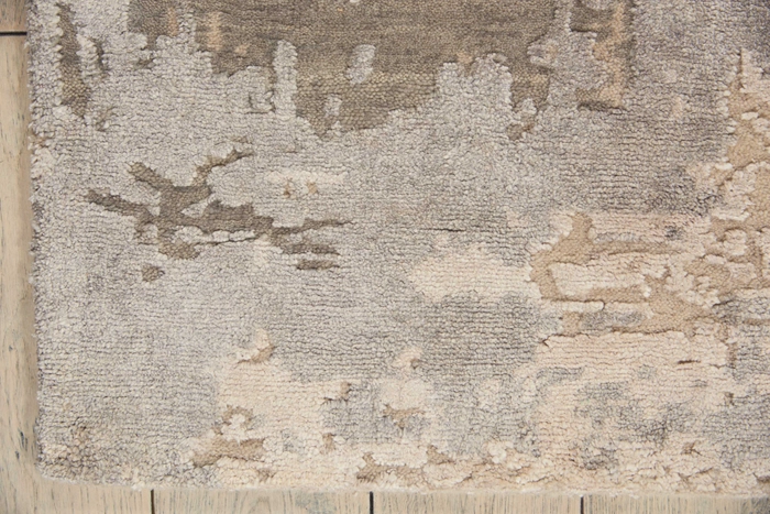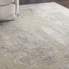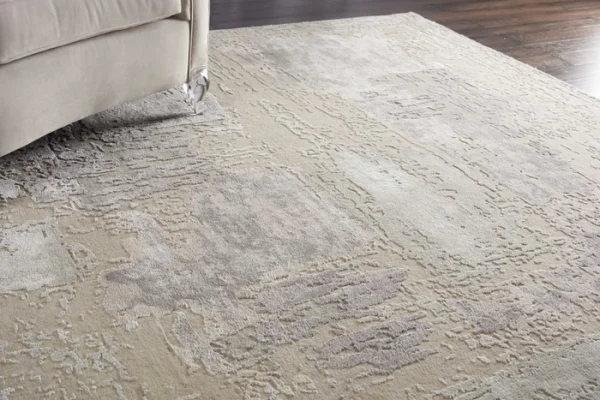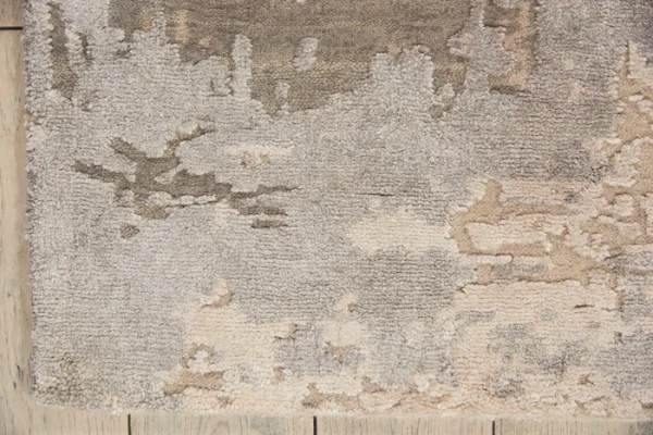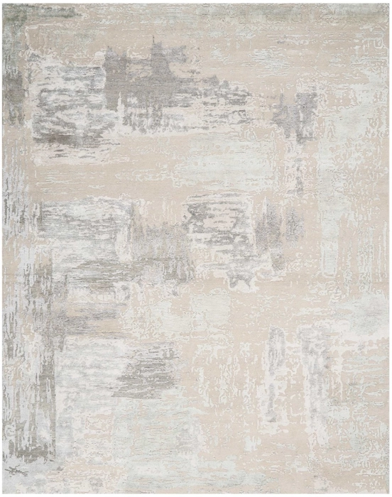 A rug that evokes the colors of misty morning dew with cool gris and ciel, creating a mood of calm and serenity.