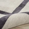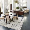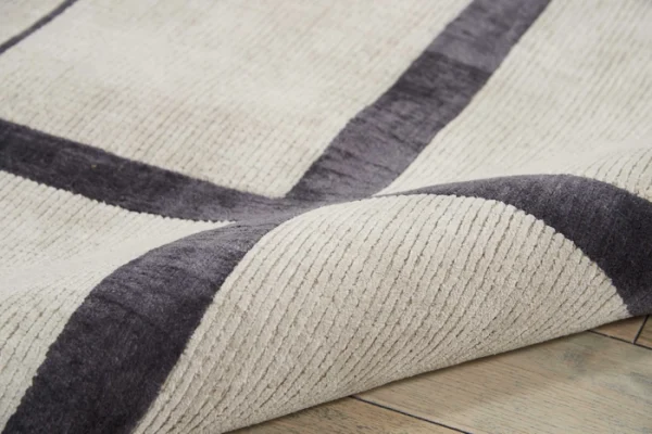 Striking black accents enhance the silvery moon of this rug, hand-woven from wool and silk.