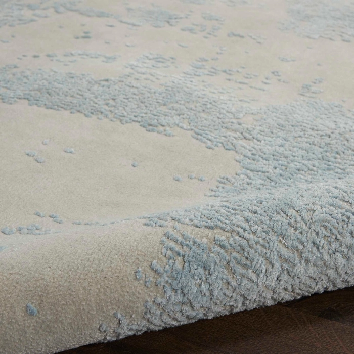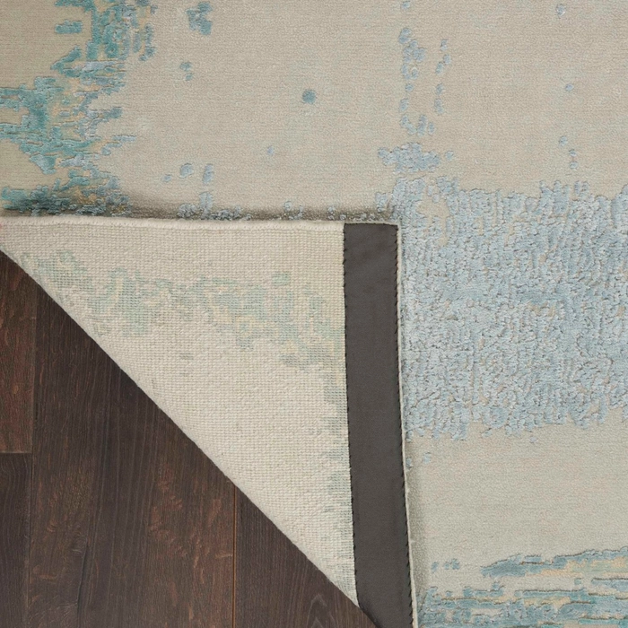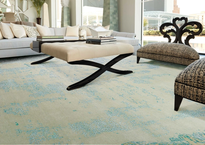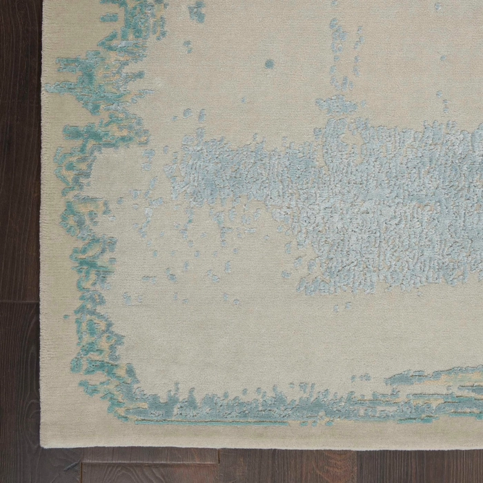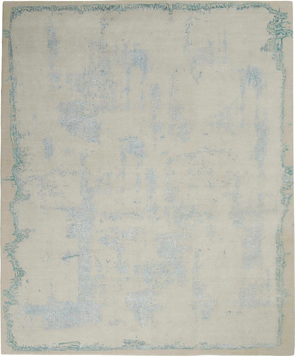 This contemporary design from the Christopher Guy Wool and Silk Collection borrows influence from traditional bordered area rugs, with a textured, distressed pattern that borders the beige field in gleaming seafom green silk. Each rug is hand knotted from pure New Zealand wool with textured silk accents, for depth and durability that brings a stunning modern aesthetic to your favotire room.