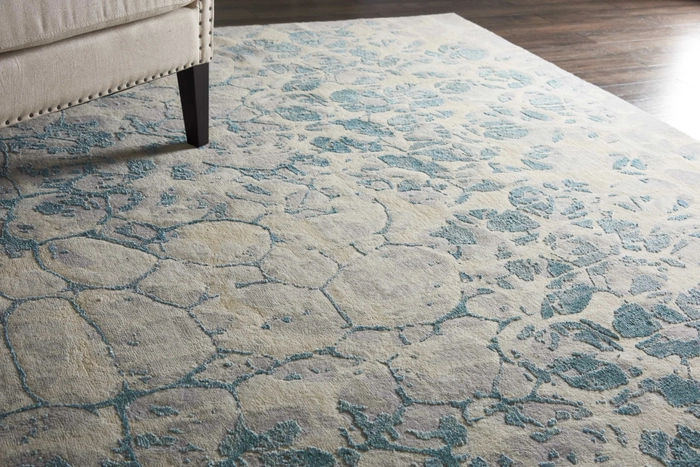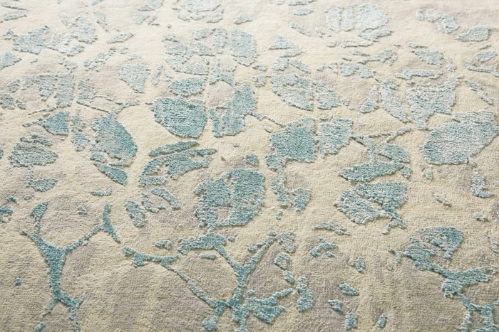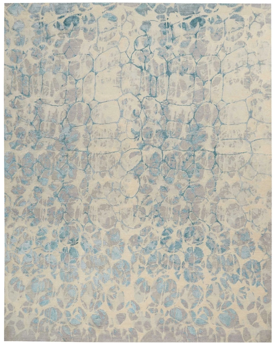 Soft wool and shimmering silk imagery create the timeless and elegant animal interpretation in this Christopher Guy rug. Raised pile patterns of striated blue play out over the hand-woven grey and beige pile of wool and silk, creating a complex, contemporary pattern.
