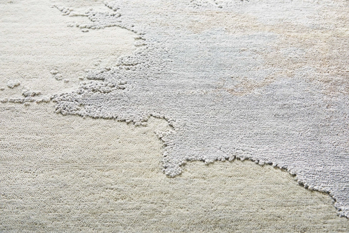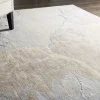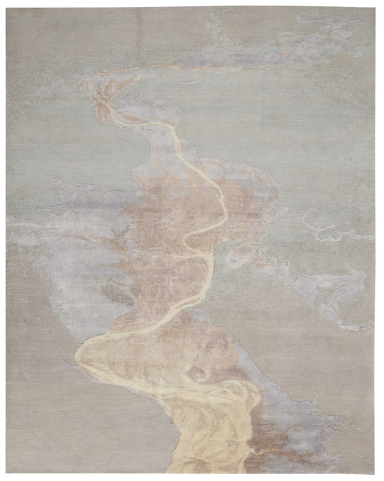 This magnificent Christopher Guy rug conveys a magical sense of motion and serenity, with flowing patterns of gold and deep earth tones flowing across the wool and silk hand-woven pile like a river. Complex coloring and intricate texturing make this rug thoroughly modern, but also utterly timeless.