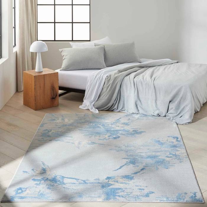 This masterful design from the Calvin Klein Enchanting Collection adds a modern sensibility to the contemporary home. In soft tones of grey and sky with a high-low cut pile, this abstract floral rug brings textural interest into your living space. A unique choice for your living room, bedroom, or home office in an easy to clean, modern fiber blend.