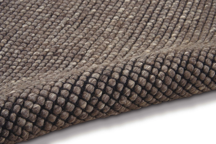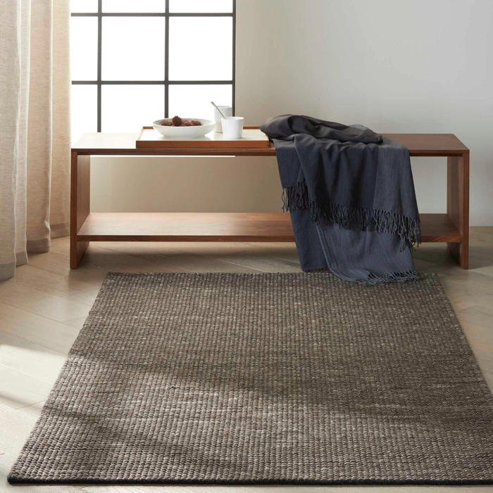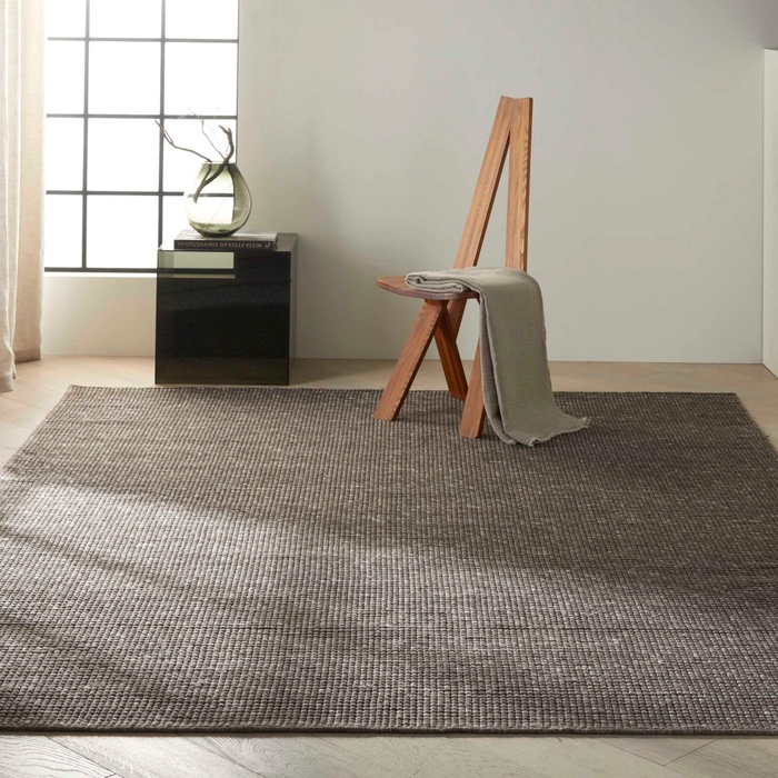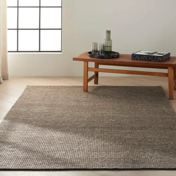 In deep charcoal and pearl tones this hand woven natural Calvin Klein Lowland wool area rug merges understated color with striking design and a stunning surface texture to offer a modern, minimalist layer of laidback luxury to any interior.