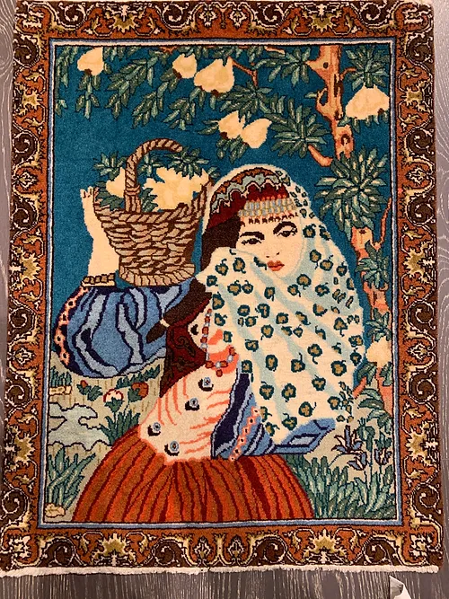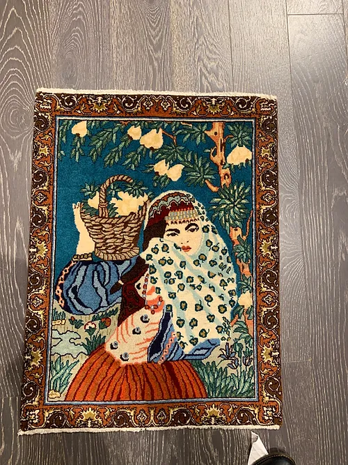 This is a beautiful hand knotted rug made in city of Tabriz of Iran. The material is 100% wool pile. The size is 1’ 8” x 2’ 2”. The colors are multi . It shows the image of a Ghashghaee girl who has a basket of flowers on her shoulder. The shipping is for mainland USA. Outside of USA please inquire about shipping before purchasing this rug.