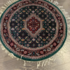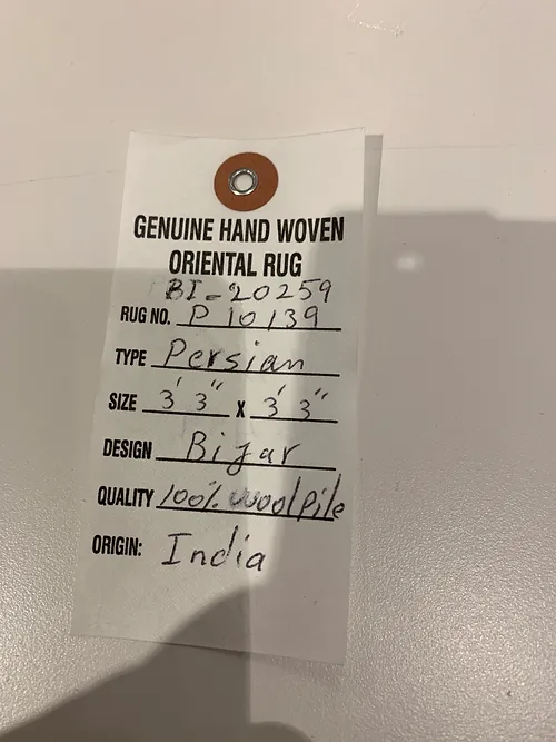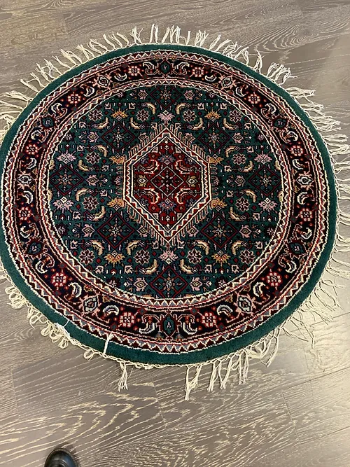 This is a beautiful hand knotted rug made in India. The material is Wool pile. The color is Green/Navy. The size is 3’ 3” x 3’ 3”. The shipping is within mainland USA. Outside of USA please inquire about shipping before purchasing this rug.