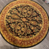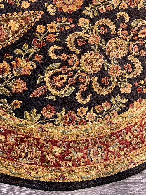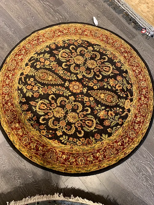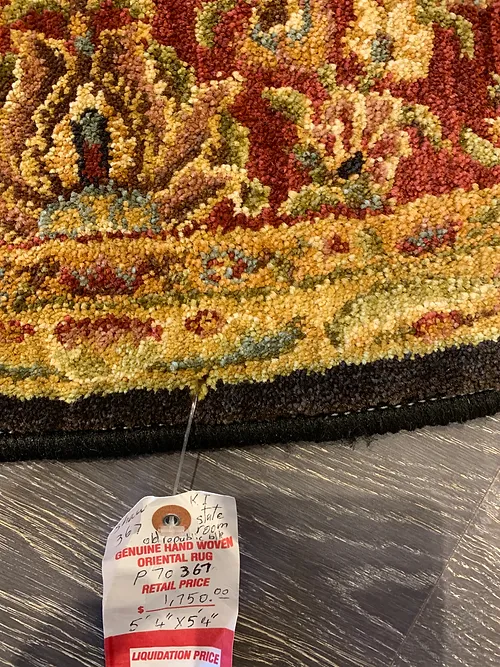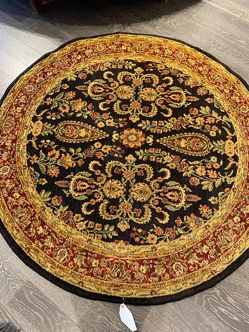 This is a beautiful machine made rug made in USA. The material is 100% Nylon pile. The color is Black/Red. The size is 5’ 4” x 5’ 4”. The shipping is within mainland USA. Outside of USA please inquire about shipping before purchasing this rug