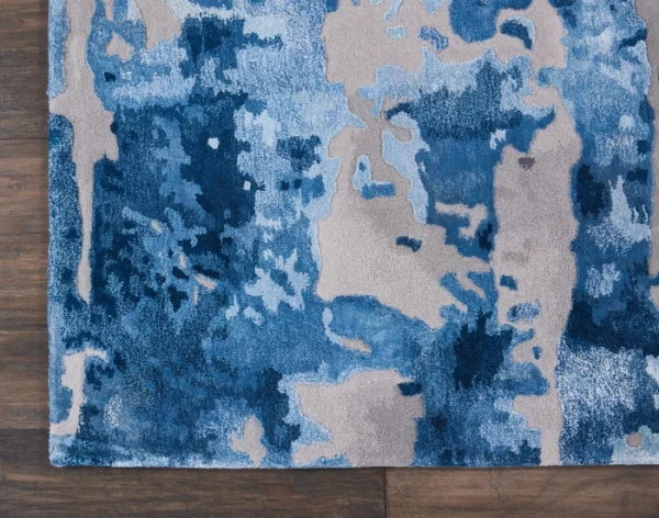 This amazingly artistic rug could adorn a wall as easily as a floor, with its modern abstract design and rich use of blue and grey hues. This hand-tufted rug features a thick, luxurious wool blend pile, carved for added dimension and texture for the perfect combination of durability, comfort, and artistic appeal.