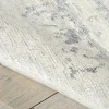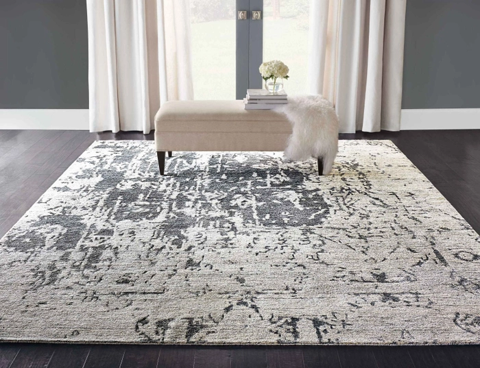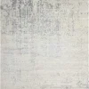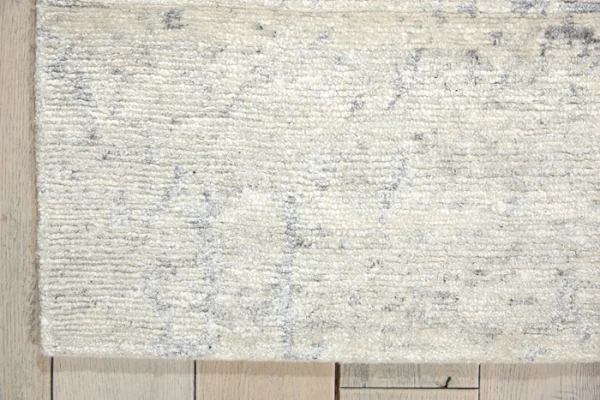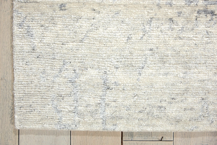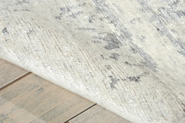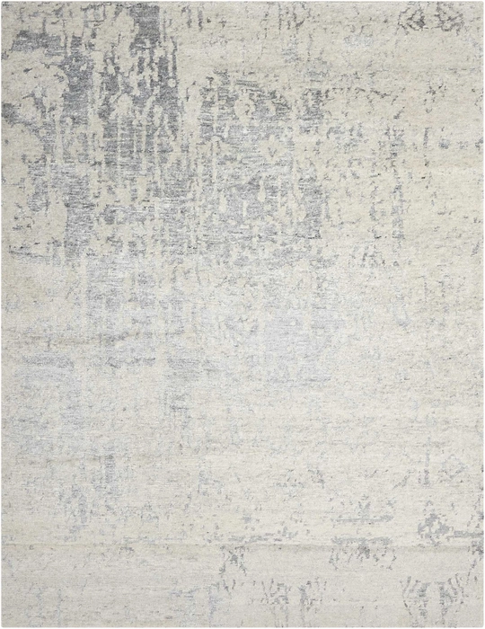 Featuring contrasting icy shades of mystical silver, a subtle abstract design and splendid shimmering highlights thanks to sensuous silk-like fibers, this mesmerizing hand-woven rug is positively magnetic in its tone, texture and dimension.