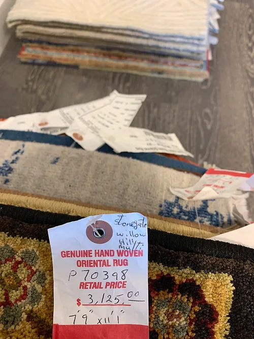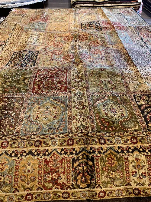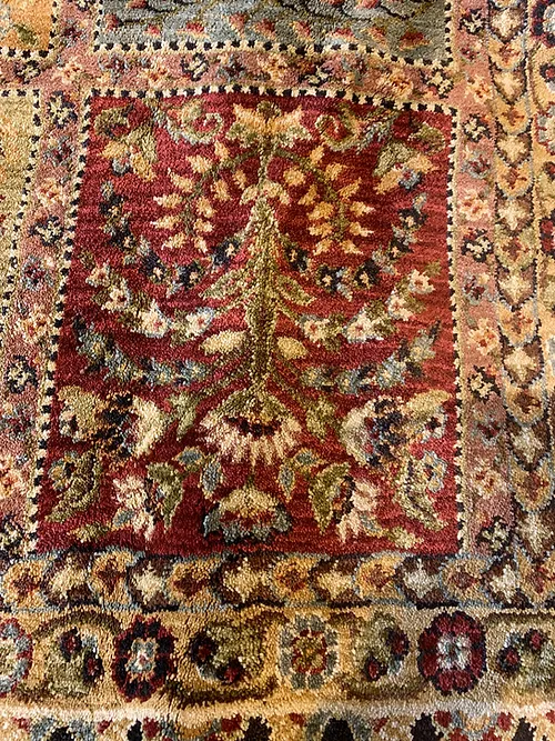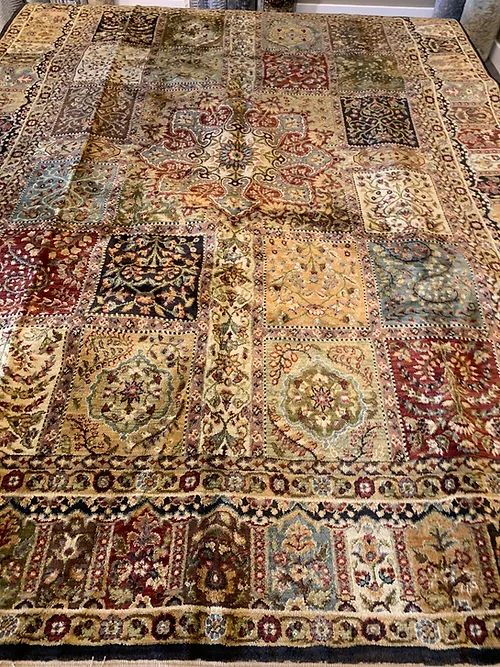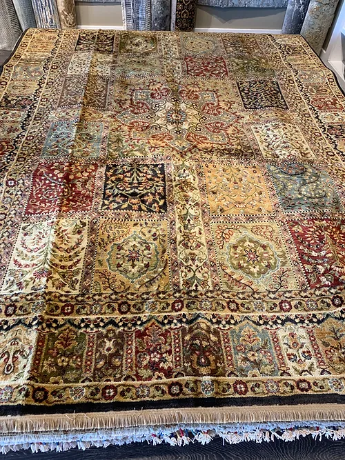 This is a beautiful machine made rug made in USA. The material is 100% Nylon pile. The color is gold. The size is 7’ 9” x 9’ 9”. The shipping is within mainland USA. Outside of USA please inquire about shipping before purchasing this rug.
