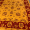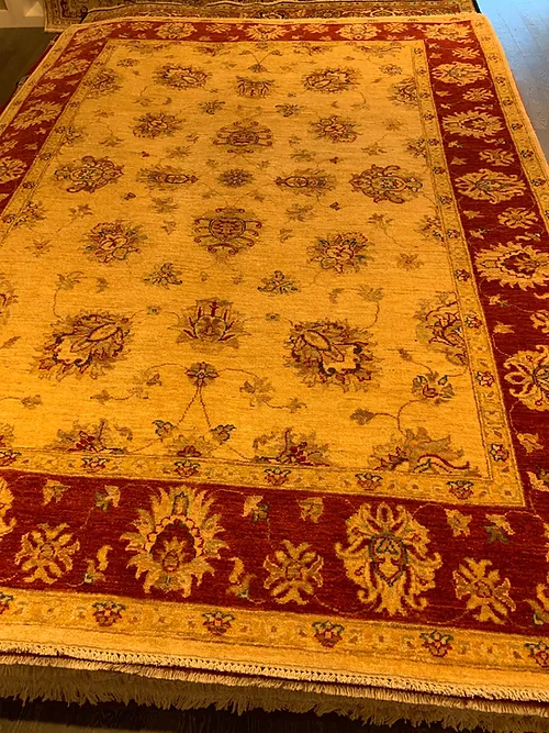 This is a fine hand knotted rug. The design is called Oushak. It is made in Pakistan.The material is 100% wool pile. The background is Ivory with Rust border. The size is 5’ 9”x 8’ 0”. The shipping is within USA. Outside of USA please inquire about shipping before purchasing this rug