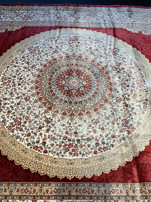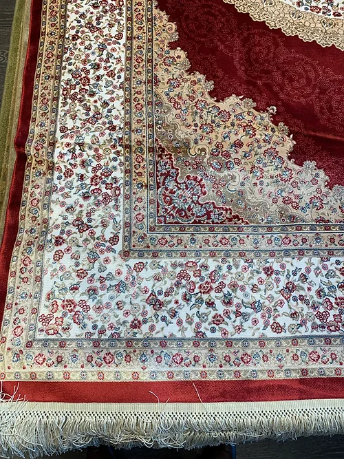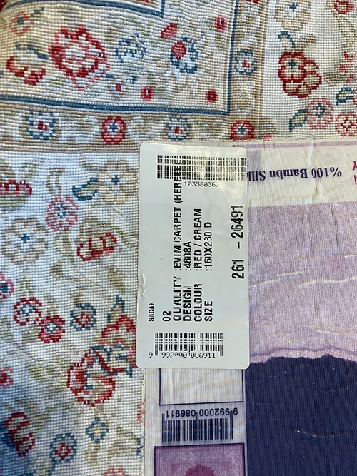 This is a very fine machine made rug. The country of origin is Turkey. The material is bamboo pile. The size is 6’4″ x 9’ 6”. The colors are red/cream. The shipping is for mainland USA. Outside of USA please inquire about shipping before purchasing this rug.