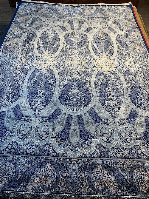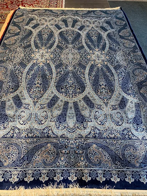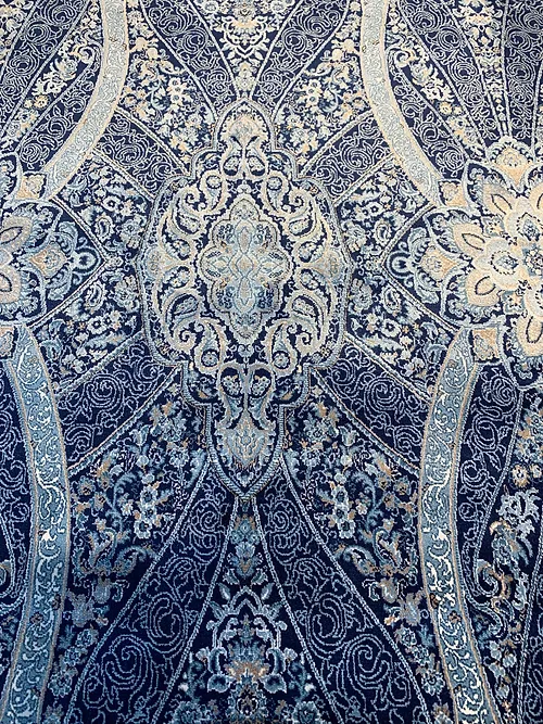 This is a very fine machine made rug. The country of origin is Turkey. The material is bamboo pile. The size is 8×10 or 240cm x 305cm. The colors are navy/navy. The shipping is for mainland USA. Outside of USA please inquire about shipping before purchasing this rug.