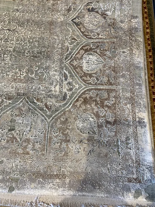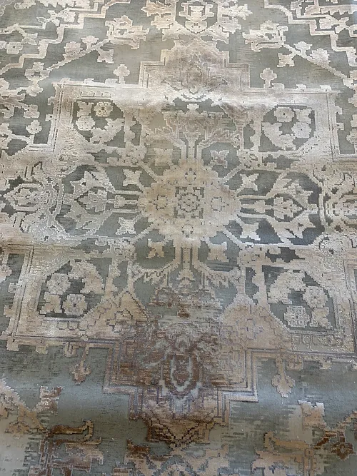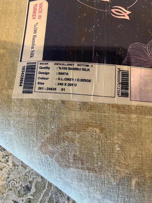 This is a natural bamboo silk made in Turkey. The size is 7′ 7″ x 10′. The colors are grey and anthracite. The shipping is for mainland USA. Outside of USA pleas3e inquire about shipping before purchasing this rug.