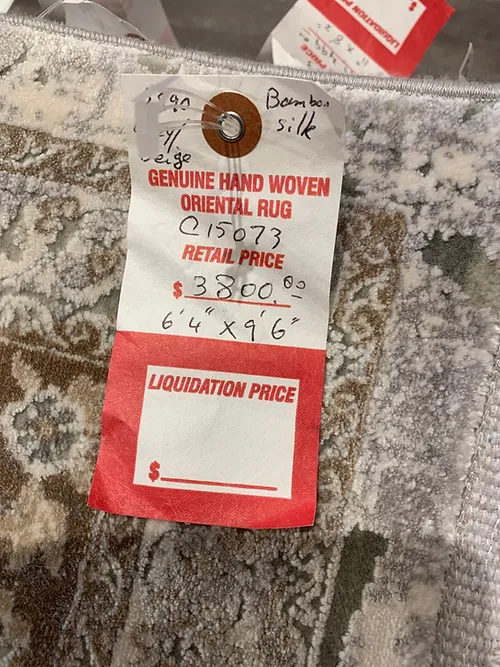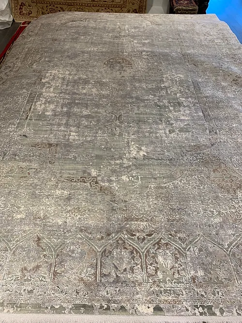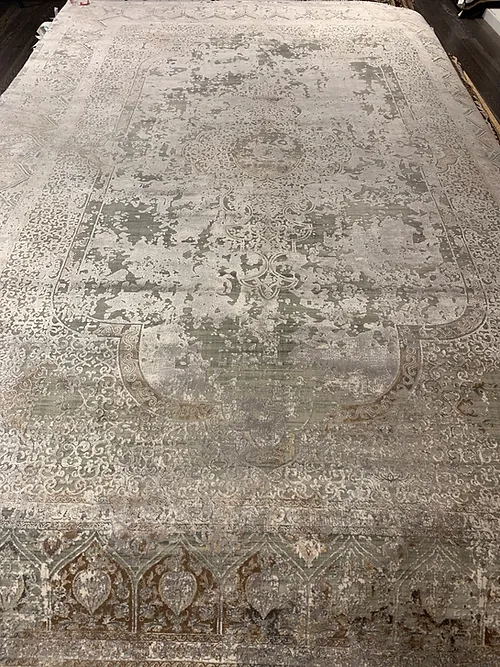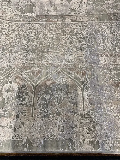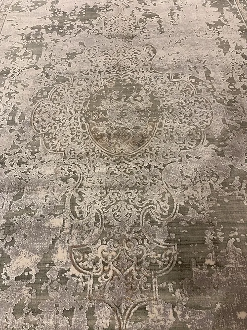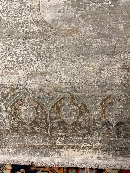 This is a beautiful transitional design of Qum rug. This is a machine made rug. It is manufactured in Turkey. The material is Natural bamboo silk. The size is 6’4” x 9’6”. The colors are light grey with dark beige. The shipping is within mainland USA. Outside of USA please inquire about shipping before purchasing this rug.