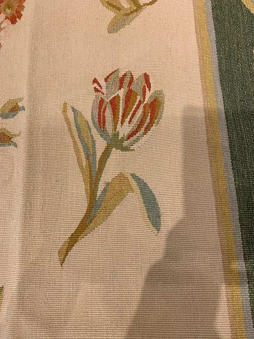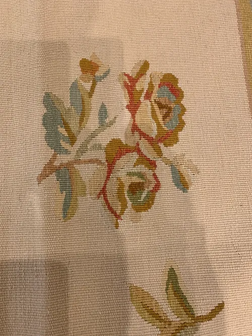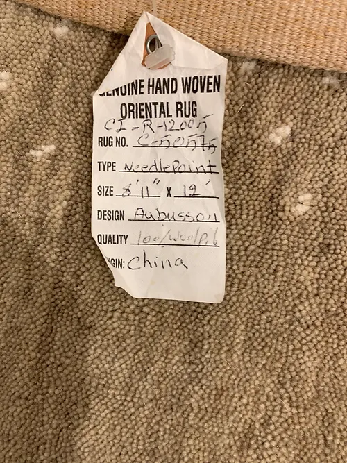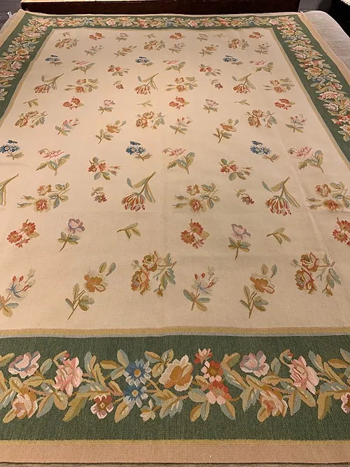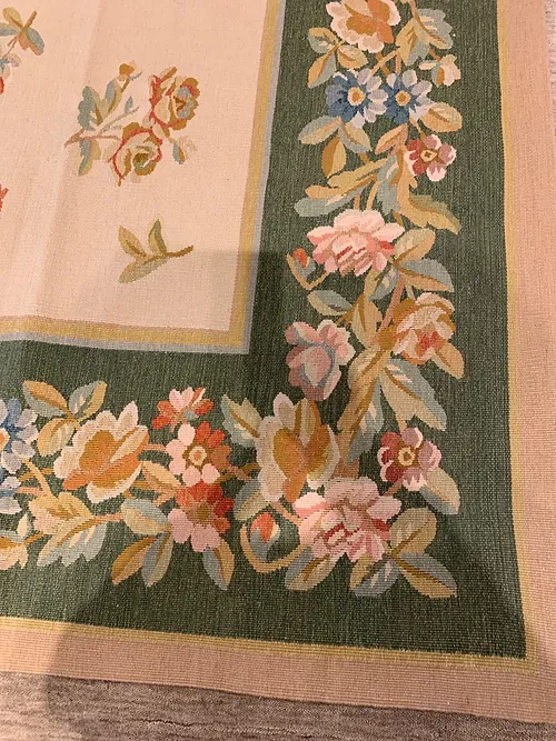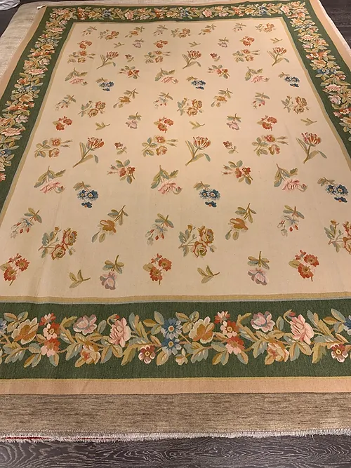 This is a fine hand knotted wool needlepoint made in China. The design is Aubusson. The size is 9’x12’. The colors are beige, peach, gold green border. The shipping is for mainland USA. Outside of USA please inquire about shipping before purchasing this rug.