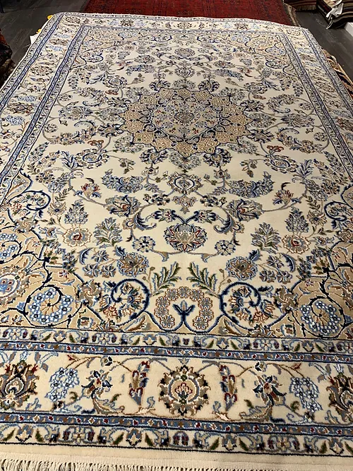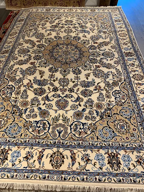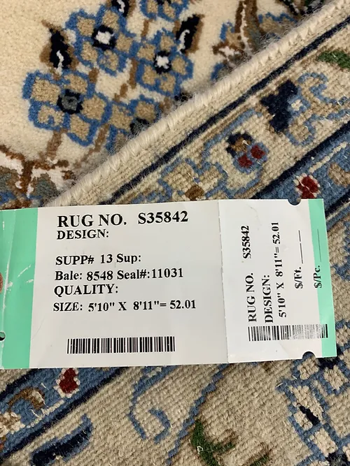 This is a fine hand knotted rug. The design is called Nain. It is made in India. The material is 100% wool pile. The background is Ivory with Ivory border. The size is 5’ 10” x 8’ 11”. The shipping is within USA. Outside of USA please inquire about shipping before purchasing this rug