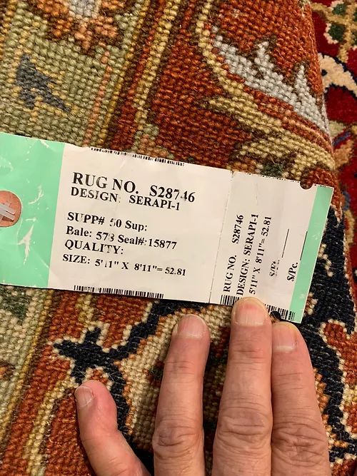 This is a fine hand knotted rug. The design is called Serapi. It is made in India. The material is 100% wool pile. The background is Navy with Rust border. The size is 5’ 11” x 8’ 11”. The shipping is within USA. Outside of USA please inquire about shipping before purchasing this rug