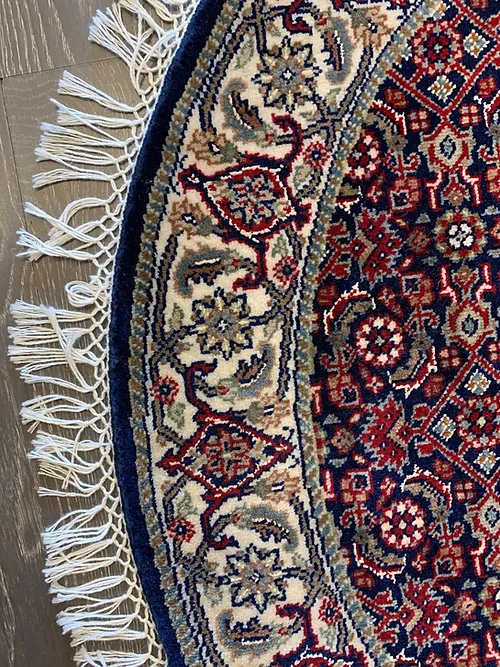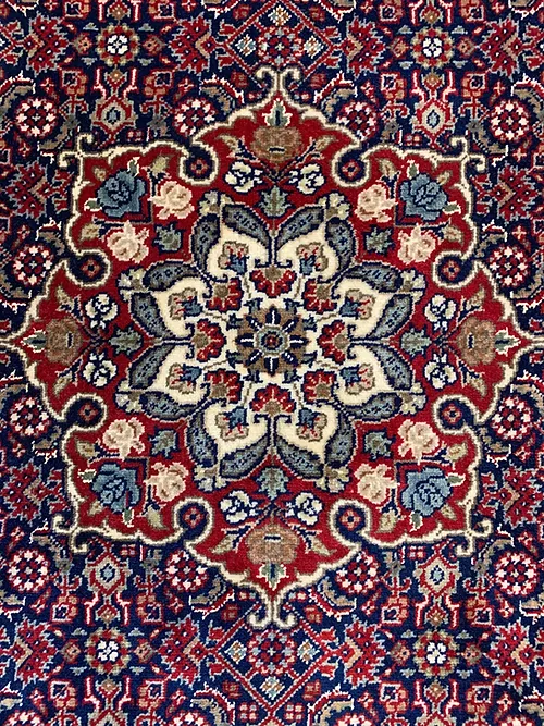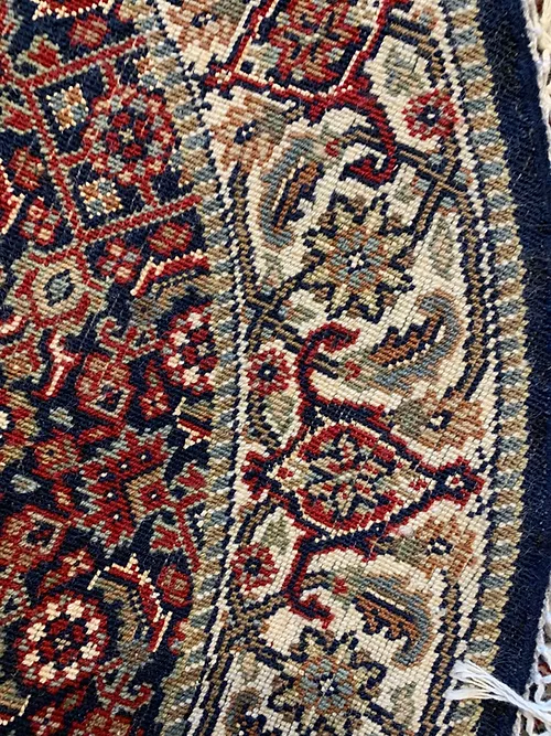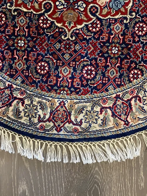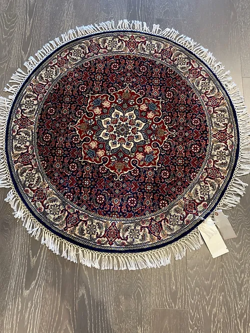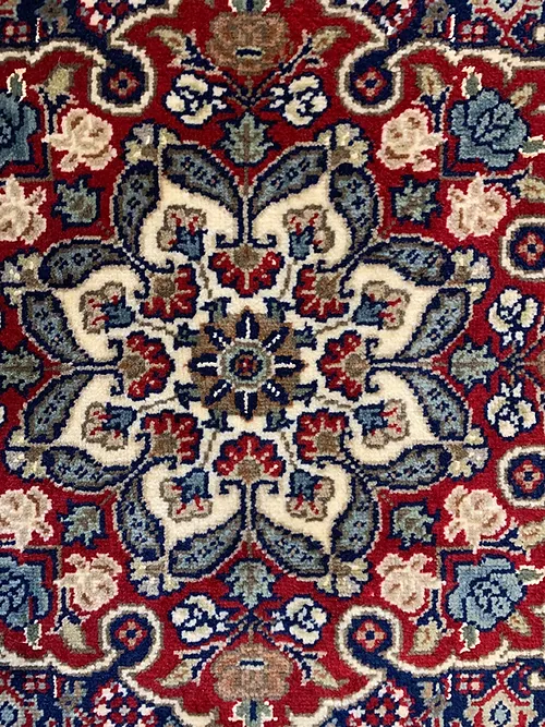 Here we are offering a beautiful hand knotted rug. The material is 100% wool pile on cotton foundation. The size is 3’x3’. The colors are red background with ivory border. The shipping is within mainland USA. Outside of USA please inquire about shipping before purchasing this rug.