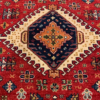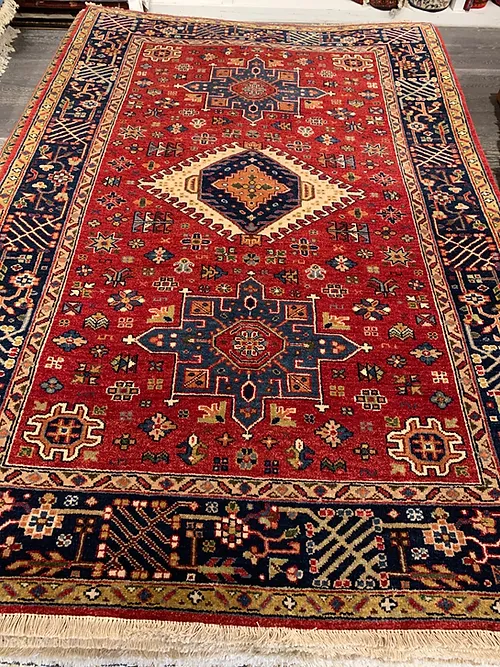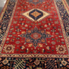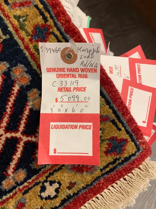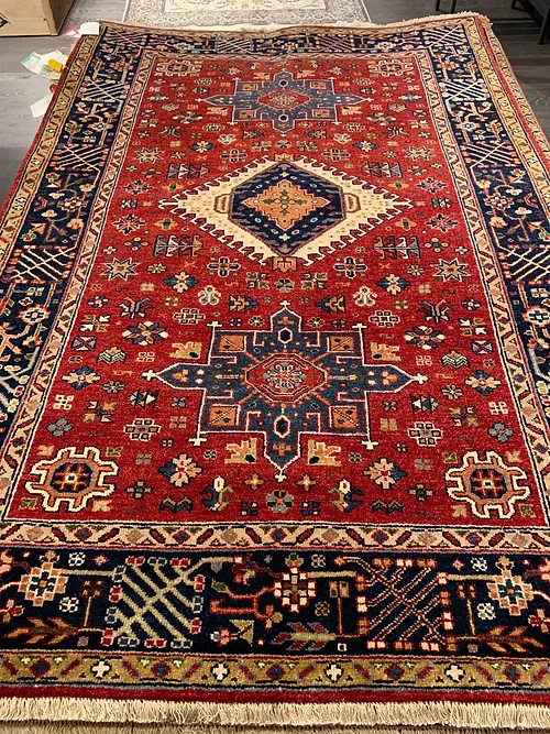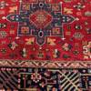 This is a hand knotted rug made in India. The size is 3’ 11” x 6’. The material is wool pile on cotton foundation. The colors are red background with navy border. The design is Serapi. The shipping is within mainland USA. Outside of USA please inquire about shipping before purchasing this rug.
