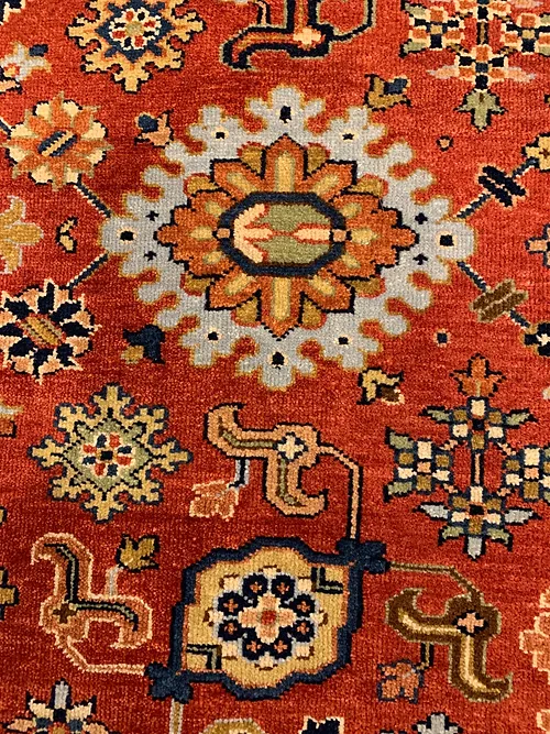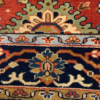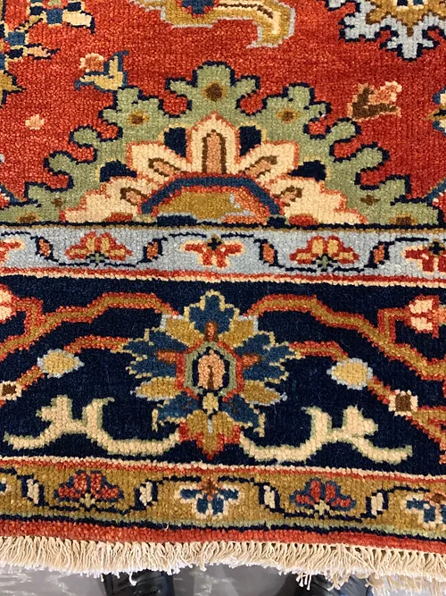 This is a hand knotted rug made in India. The size is 4’ x 6’. The material is wool pile on cotton foundation. The colors are red background with navy blue border. The design is allover Serapi. The shipping is within mainland USA. Outside of USA please inquire about shipping before purchasing this rug.