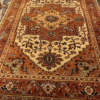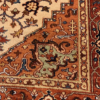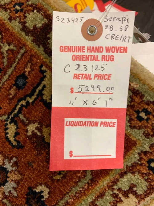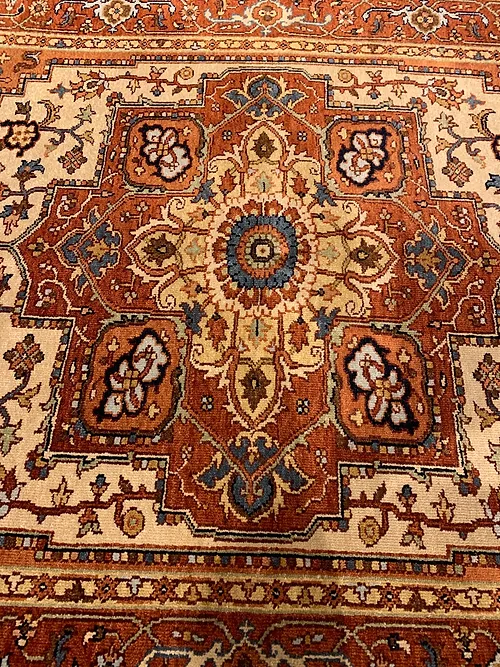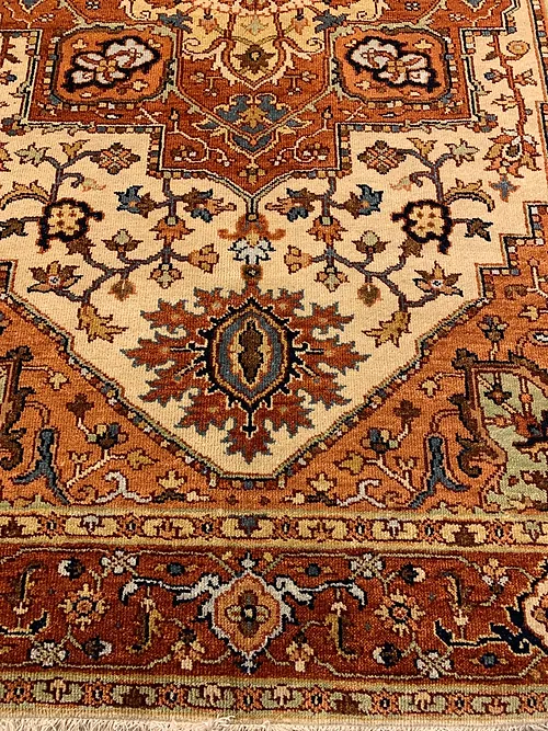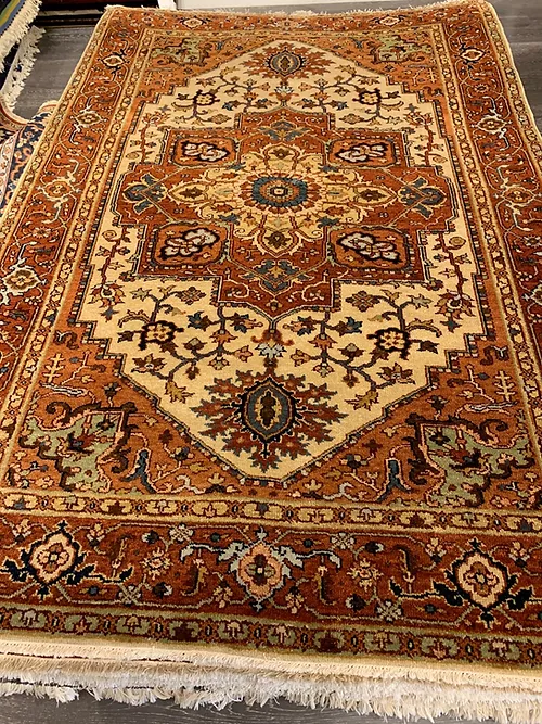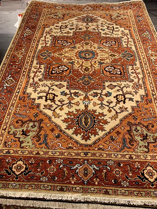 This is a hand knotted rug made in India. The size is 4’ x 6’ 1”. The material is wool pile on cotton foundation. The colors are ivory background with rust border. The design is Heriz Serapi. The shipping is within mainland USA. Outside of USA please inquire about shipping before purchasing this rug.