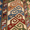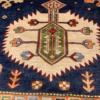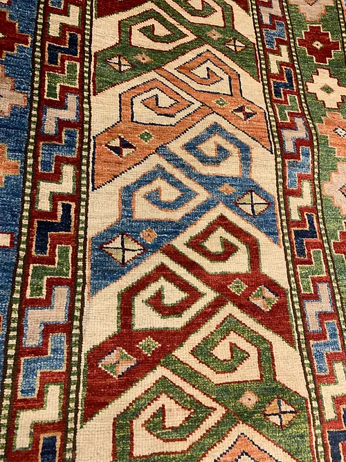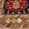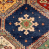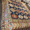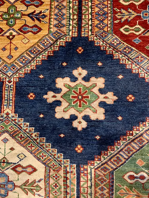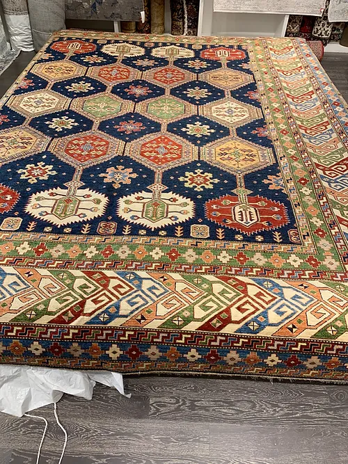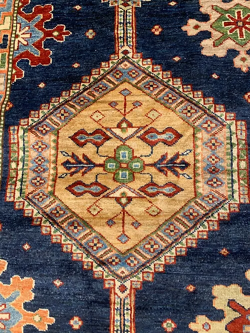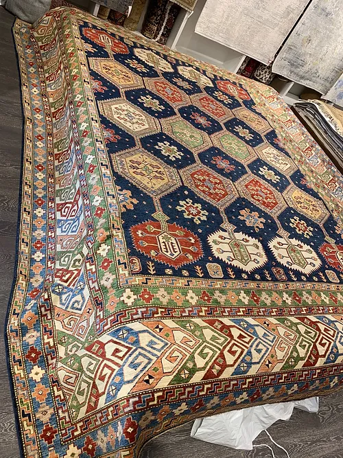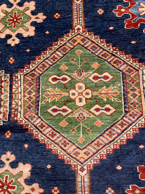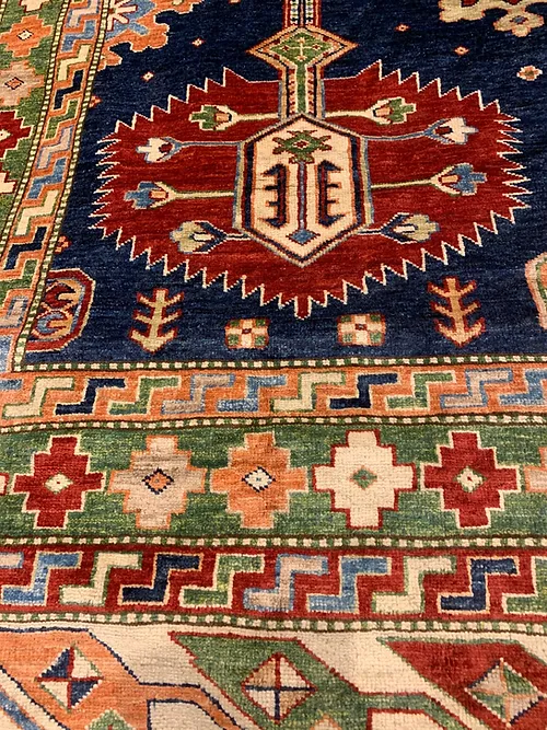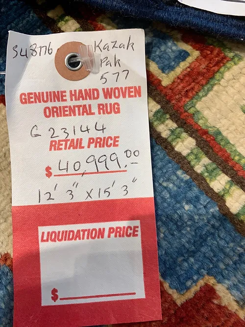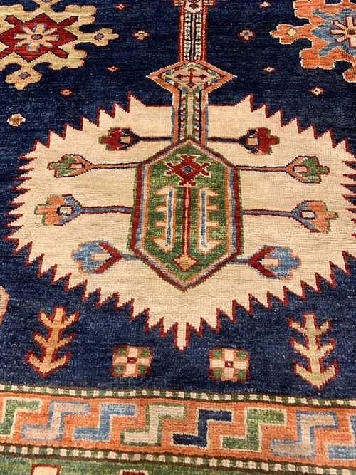 A beautiful hand knotted 100% wool pile Kazak. It is made in Pakistan. The colors are navy background with ivory border. The design is geometric design all over. The size is 12’ 3” x 15’ 3”.