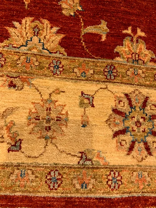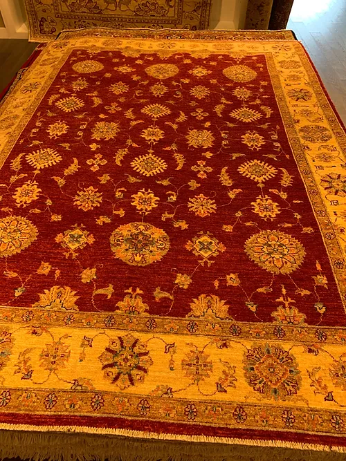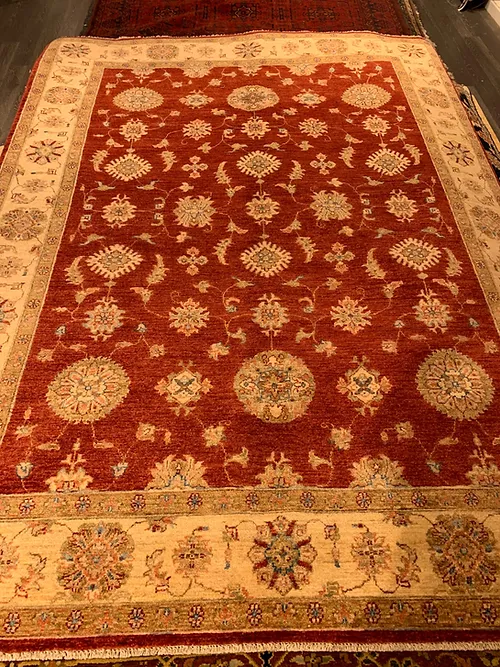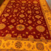 This is a fine hand knotted rug. The design is called Oushak. It is made in Pakistan.The material is 100% wool pile. The background is Rust with Ivory border. The size is 5’ 11” x 8’ 2”. The shipping is within USA. Outside of USA please inquire about shipping before purchasing this rug