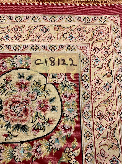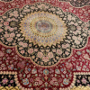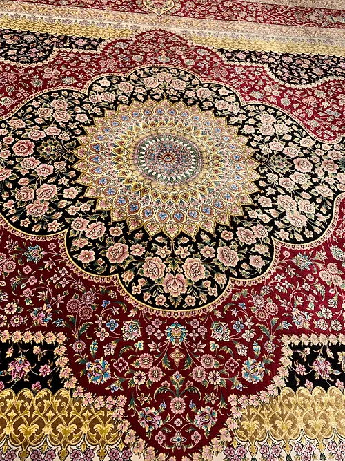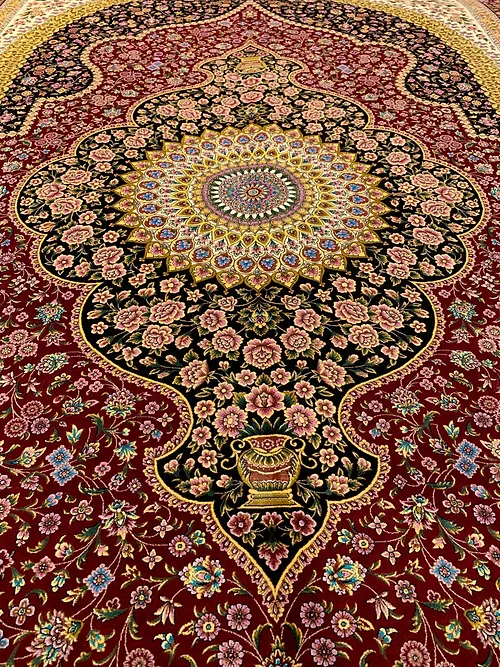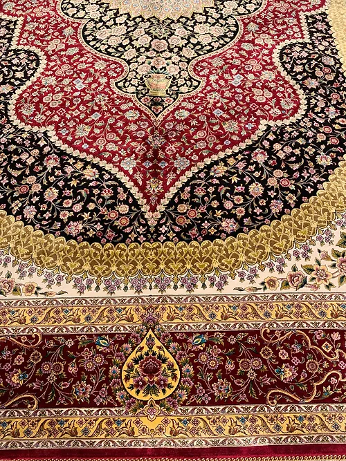 Here is a very beautiful machine made Persian rug. The design is Qum (Ghom). The size is 6’ 7” x 9’ 7”. The colors are black and burgundy background with burgundy and gold border. The material is bamboo silk. The shipping is for mainland USA. Outside of USA please inquire about shipping before purchasing this rug