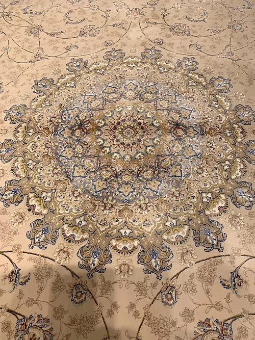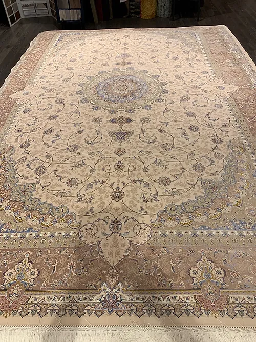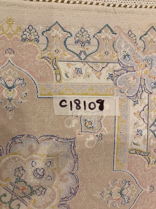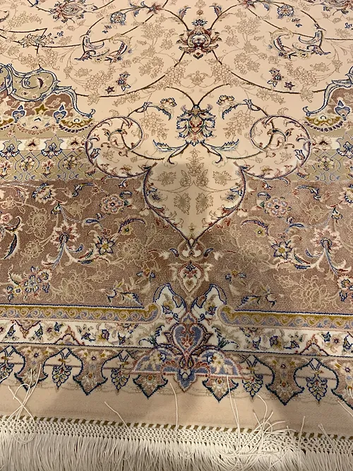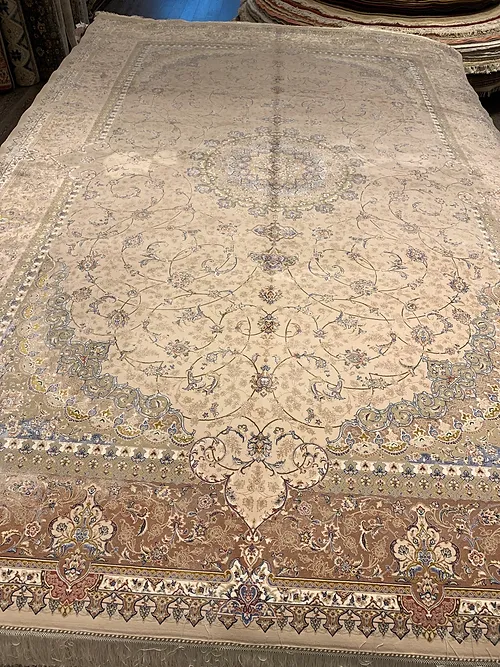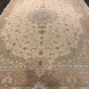 Here is a very beautiful machine made Persian rug. The design is Tabriz with medallion.The size is 6’ 7” x 9’ 7”. The colors are ivory background with beach border. The shipping is for mainland USA. Outside of USA please inquire about shipping before purchasing this rug