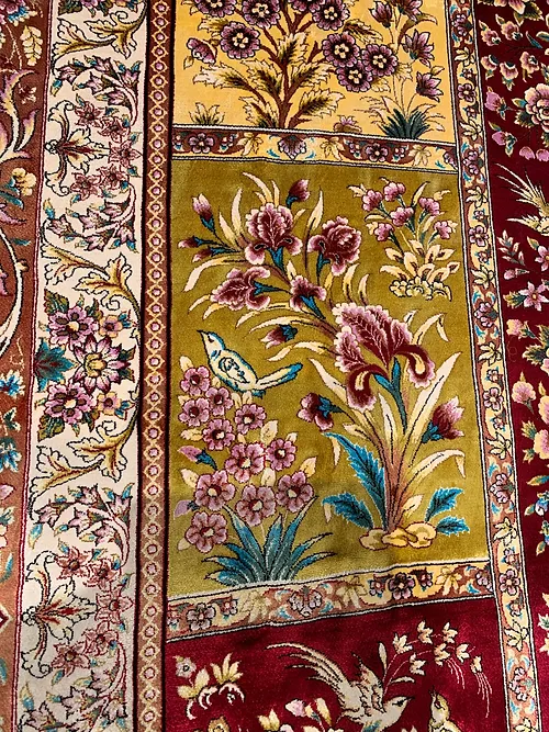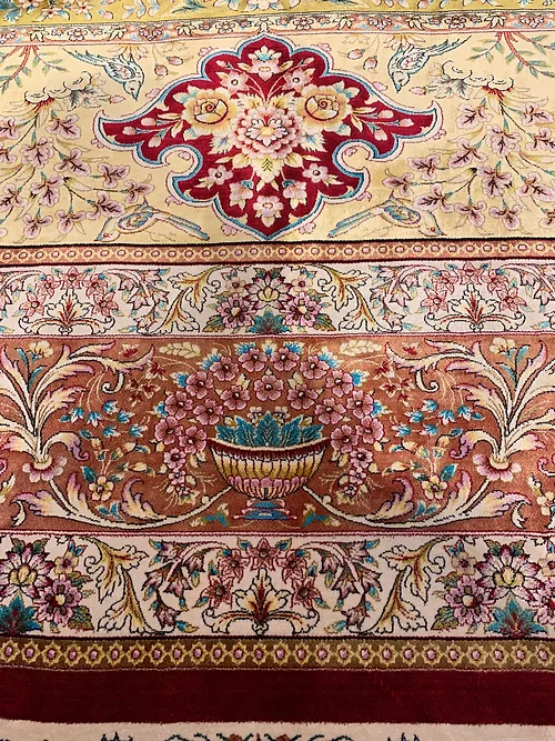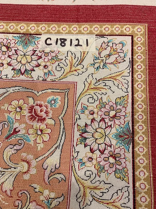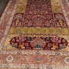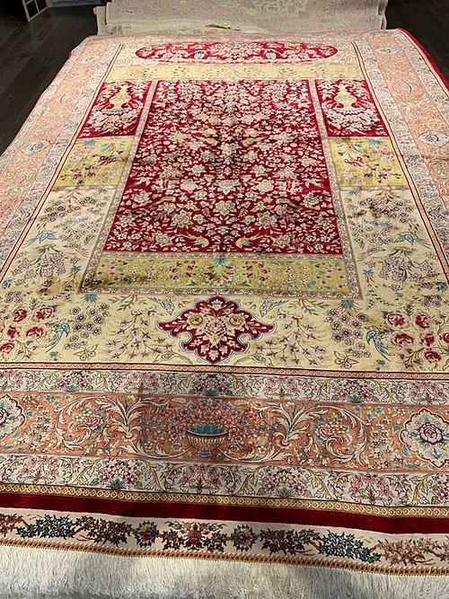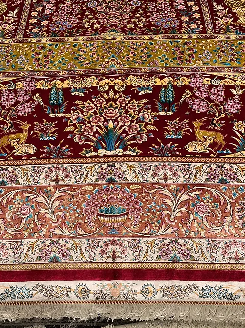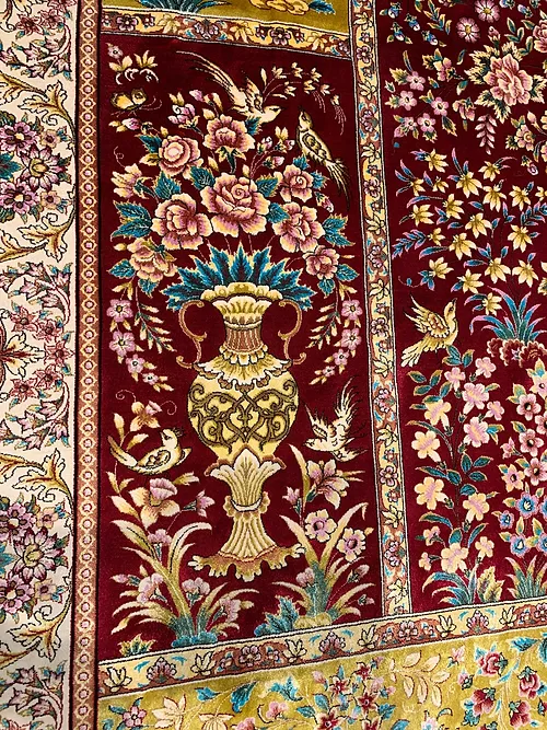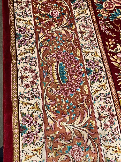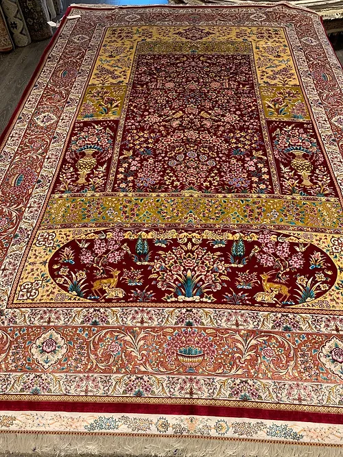 Here is a very beautiful machine made Persian rug. The design is Qum (Ghom). The size is 6’ 7” x 9’ 7”. The colors are burgundy, olive, beige background with peach border. The material is bamboo silk. The shipping is for mainland USA. Outside of USA please inquire about shipping before purchasing this rug