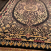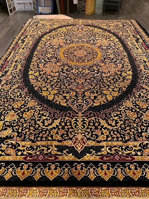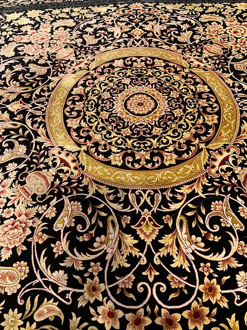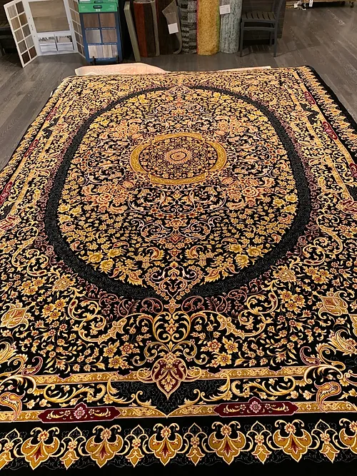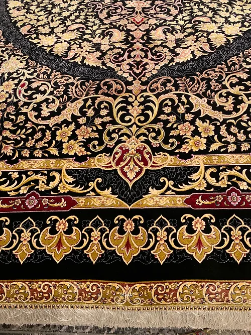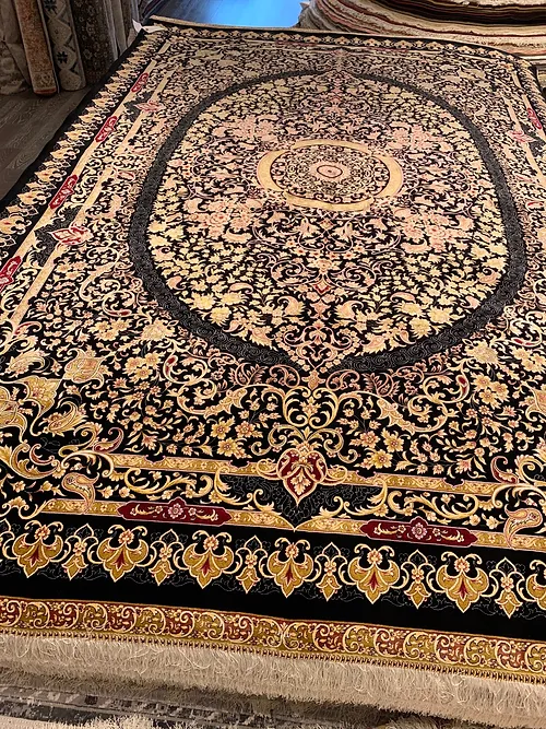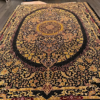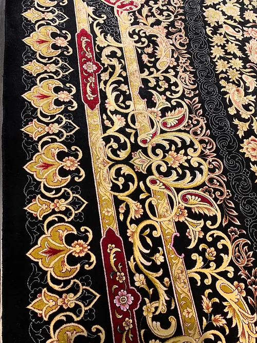 Here is a very beautiful machine made Persian rug. The design is Qum (Ghom). The size is 6’ 7” x 9’ 7”. The colors are black background with black and gold border. The shipping is for mainland USA. Outside of USA please inquire about shipping before purchasing this rug