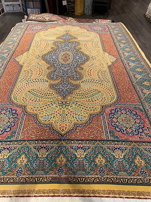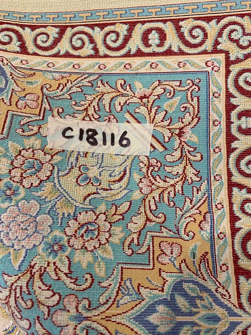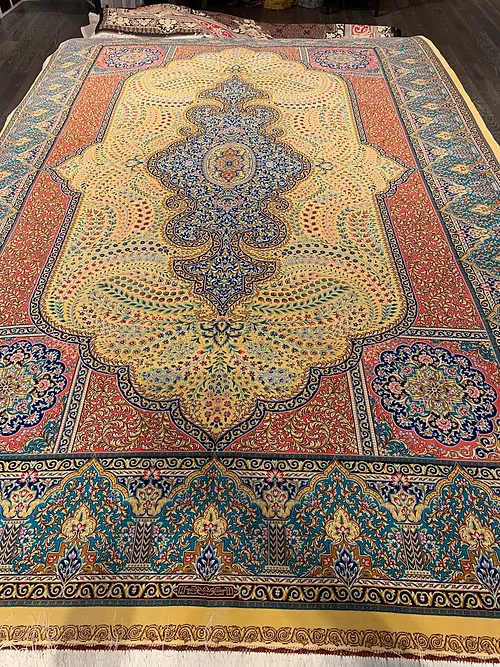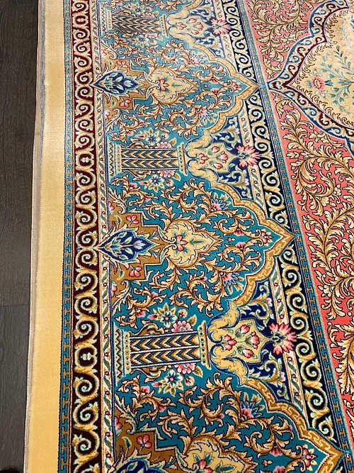 Here is a very beautiful machine made Persian rug. The design is Qum (Ghom). The size is 6’ 7” x 9’ 7”. The colors are background with turquoise and pink border. The shipping is for mainland USA. Outside of USA please inquire about shipping before purchasing this rug