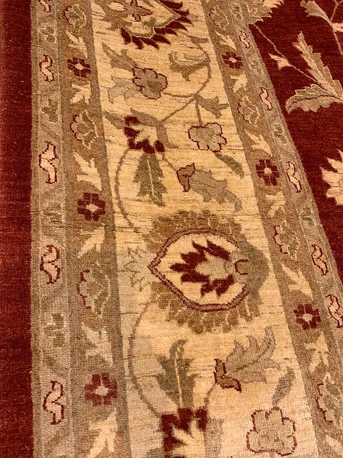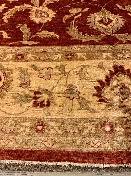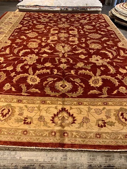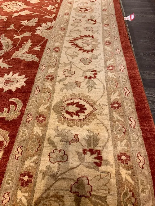 This is a very beautiful Peshawar rug made in Pakistan. The d sign is called Oushak. The colors are Rust background with Ivory border. The size is 11’x 15’. The material is wool pile on cotton foundation. The shipping is for mainland USA. Outside of USA please inquire about shipping before purchasing this rug.