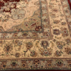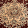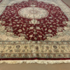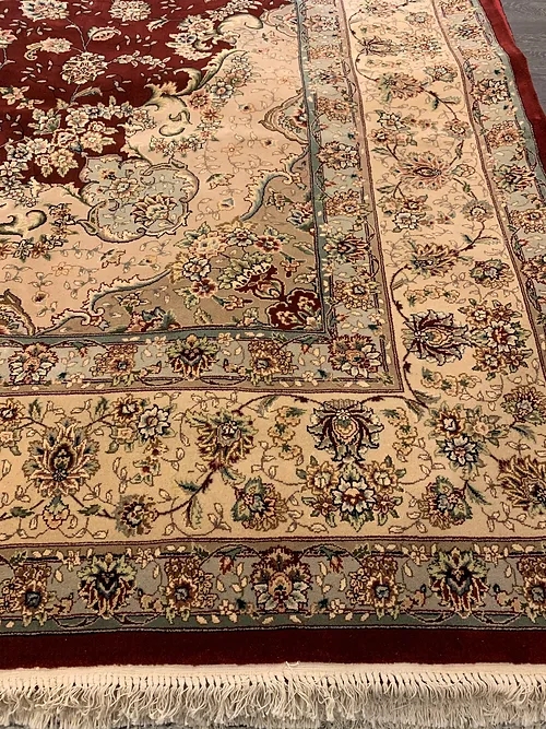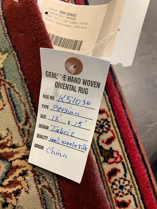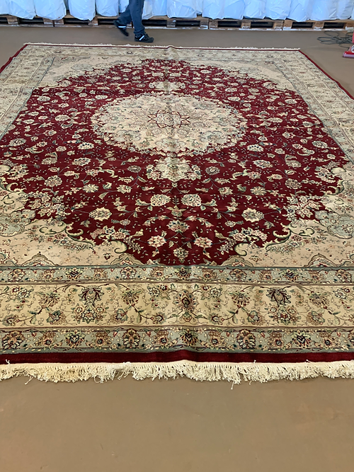 This is a hand knotted rug made in China. The material is wool and silk. The colors are burgundy background with taupe border. The size is 12’ x 15’. The shipping is within mainland USA. Outside of USA please inquire about shipping before purchasing this rug.